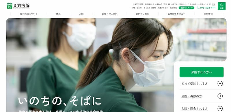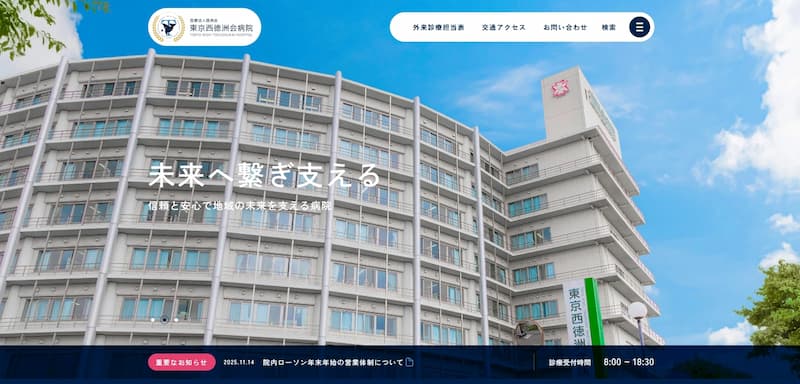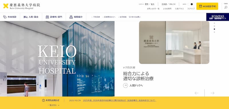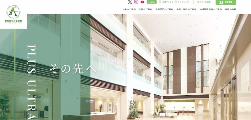 救命救急センターやダビンチ手術、CAR-T療法など先進医療の情報も充実しており、歴史ある病院としての信頼感と、現代的で洗練されたデザインが調和したホームページです。