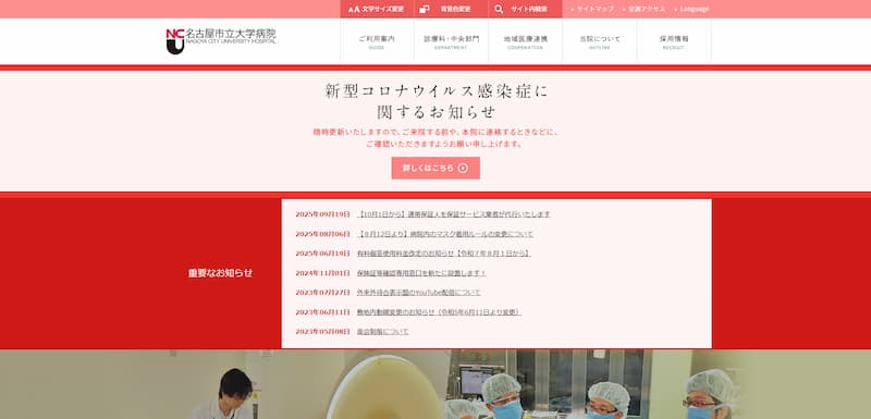 名古屋市立大学病院のホームページは、白と赤を基調としたデザインで、利用者のニーズに応じた情報が整理されています。