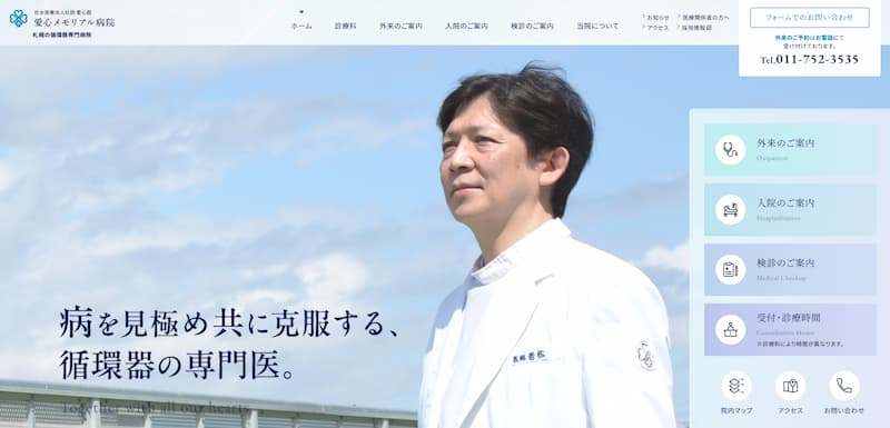 愛心メモリアル病院のホームページは、札幌市の循環器専門病院として急性期医療から在宅ケアまでの切れ目ないサービスを提供する姿勢が伝わるデザインです。