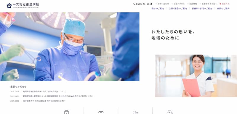 地域の中核病院として、救急医療や災害医療の取り組みが詳しく紹介されており、専門性の高い医療情報も充実しています。