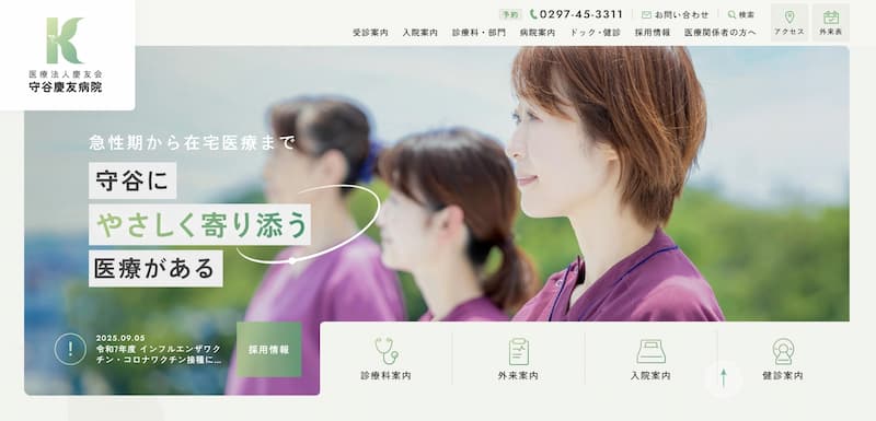 患者さん向けの外来案内や地域医療関係者向けの連携情報が整理されており、ユーザビリティに配慮した使いやすいホームページとなっています。