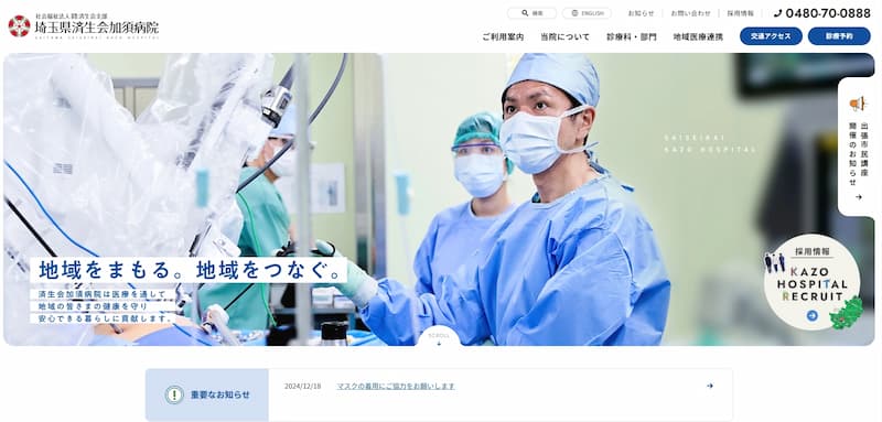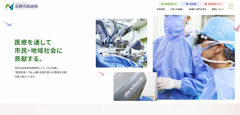 特にダビンチSPによるロボット支援手術など先進医療の取り組みや、看護師特定行為研修などの専門性の高い情報も発信されています。全体的に清潔感のあるデザインで、医療機関としての信頼性と先進性を両立させたホームページとなっています。
