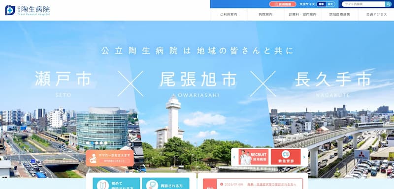 公立陶生病院のホームページは、瀬戸市・尾張旭市・長久手市の3市が運営する公立総合病院として、地域に根差した医療を提供する姿勢が伝わるデザインです。