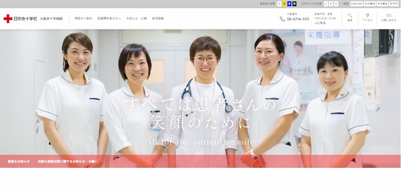 大阪赤十字病院のホームページは、日本赤十字社の博愛精神に基づいた高度医療を提供する基幹病院として、患者さん目線の使いやすさを追求したデザインが特徴です。
