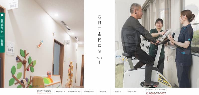 春日井市民病院のホームページは、爽やかな緑と白を基調とした親しみやすいデザインが印象的です。