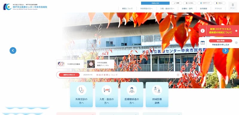 神戸市立医療センター中央市民病院のホームページは、青を基調とした落ち着いたデザインと使いやすいナビゲーションが魅力です。