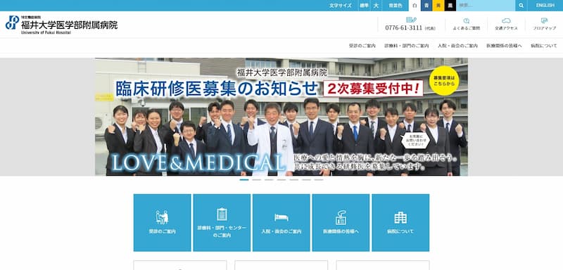 福井大学医学部附属病院のホームページは、患者さんに必要な情報を分かりやすく整理したデザインが特徴です。