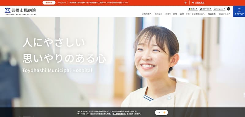 豊橋市民病院のホームページは、清潔感のある青と白を基調としたデザインが特徴的です。