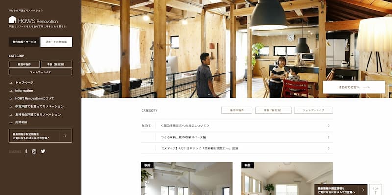 物件情報だけでなく、建築家や施工会社とのマッチングサービスも提供しており、理想の住まいづくりをトータルでサポートします。リノベーション事例は詳細な写真とともに工事内容や費用も公開されており、具体的なイメージを掴みやすい構成です。