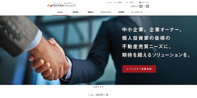 野村不動産グループが展開する総合不動産流通会社として、個人・法人向けの売買仲介やCREソリューションを提供しており、サイト全体に信頼感のあるコーポレートカラーが用いられています。