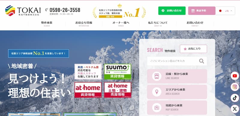 トップページには売買・賃貸・リロケーションなど、目的別に分かりやすくメニューが配置されています。