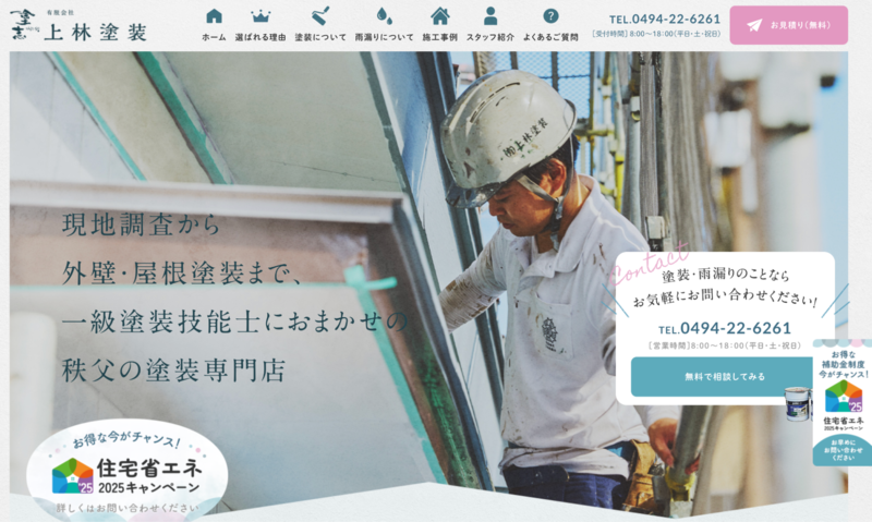 有限会社上林塗装のホームページは、創業70年・実績3,000件超という信頼感を打ち出しながら、地元密着型の専門性を感じさせるデザインが印象的です。