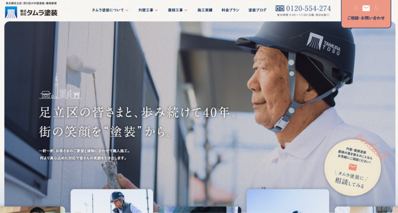 株式会社タムラ塗装は「足立区の皆さまと、歩み続けて40年。」というコピーが象徴するように、地域密着型の姿勢を前面に打ち出したホームページです。