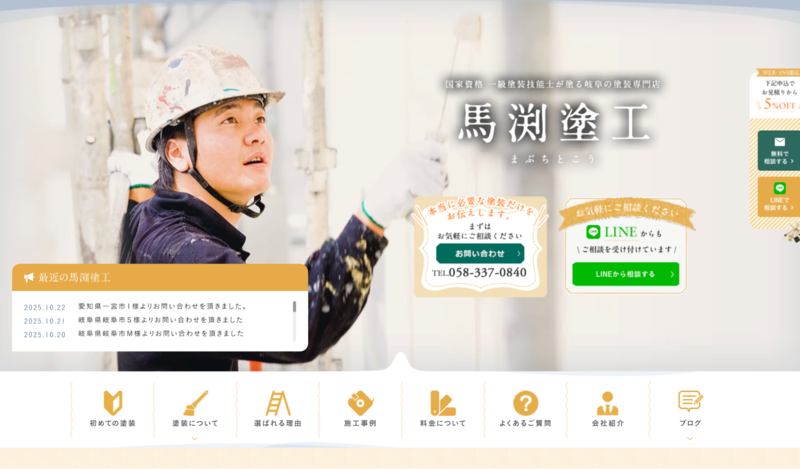 株式会社馬渕塗工のホームページは、代表の施工に対する想いや専門性が丁寧に記載され、顔の見える安心感を与える点が特徴です。