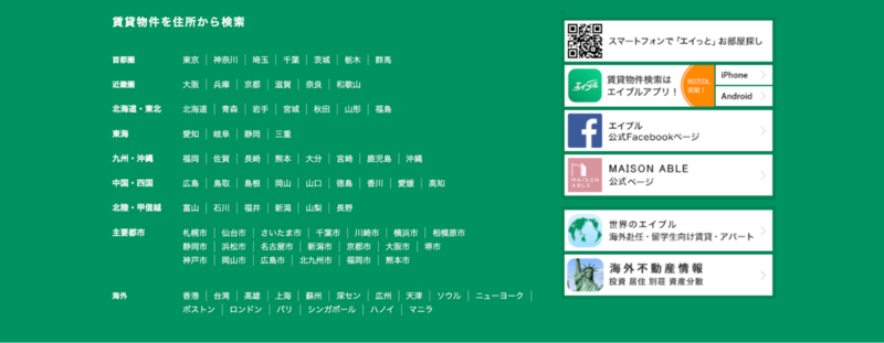 株式会社エイブルのフッターは、地域別・目的別に整理されたリンク設計が特徴です。